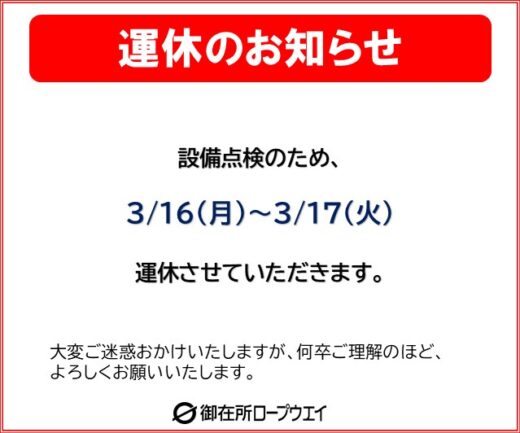 こんにちは 三重県 湯の山温泉旅館寿亭でございます御在所ロープウエイは下記の期間を設備点検のため運休いたします。令和8年3月16日(月)~令和8年3月17日(火)の2日間なお、お土産店も休止となる場合がございますどうぞご注意くださいませ